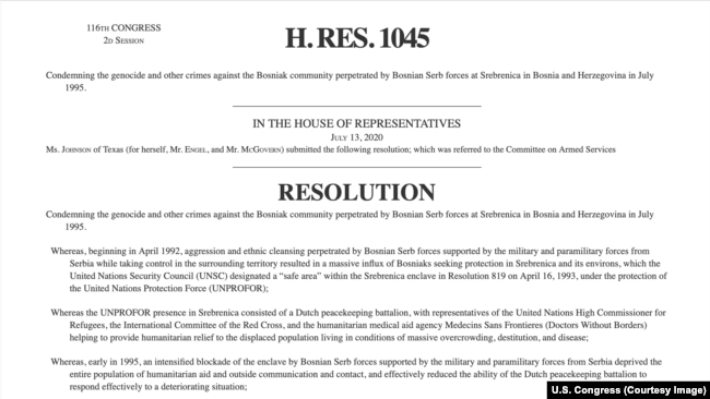Zastupnica u američkom Predstavničkom domu Eddie Bernice Johnson uputila je u ovaj dom Rezoluciju o osudi genocida i drugih zločina nad Bošnjacima koje su počinile srpske snage u Srebrenici u julu 1995. godine.