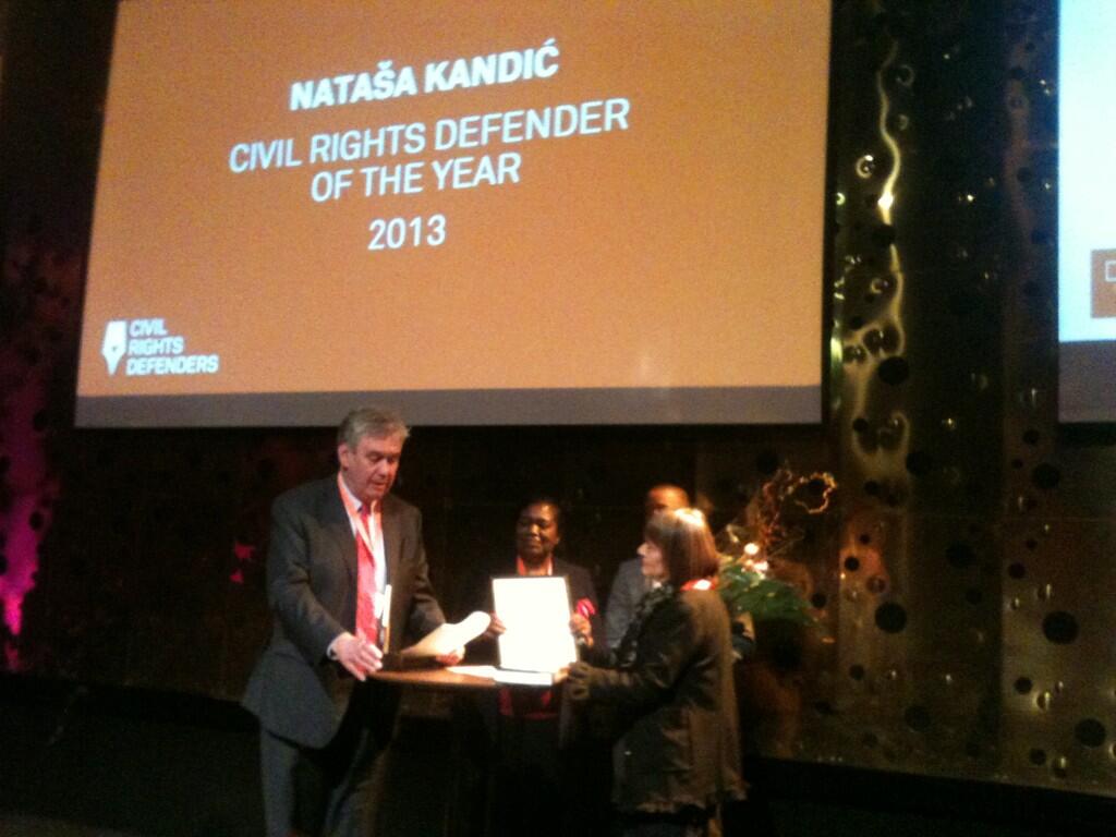 STOKHOLM, 4. aprila 2013. – Osnivačica Fonda za humanitarno pravo Nataša Kandić proglašena je danas u Stokholmu braniteljkom građanskih prava godine u svetu, a to priznanje dodelila joj je švedska nevladina organizacija (Civil Rights Defenders-Branitelji građanskih prava-CRD).